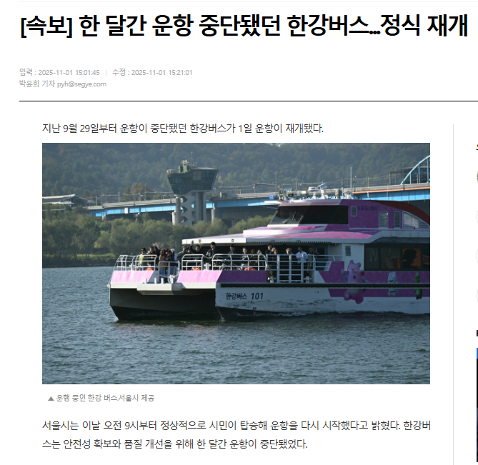 속보) 한 달간 운항 중단됐던 한강버스...정식 재개